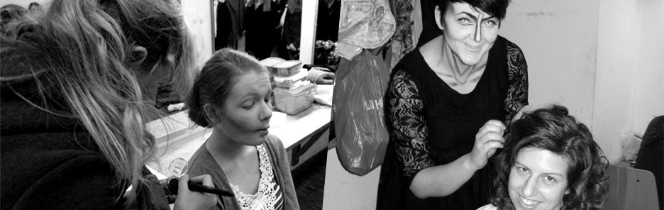 Die Maskenbildner sind zuständig für Haare und Make-up der Darsteller und überzeugen mit ihrem Elan selbst den härtesten Kerl von Puderdose und -pinsel. Gegen Ende der Probenphase zeigen sie den Darstellern, wie sie sich vor den Aufführungen zu schminken haben und mit ein bisschen Übung gelingt dieses malerische Kunstwerk auf dem eigenen Gesicht dann auch in zufriedenstellender Weise. Gerne wird aber das Einsingen vor jeder Aufführung von den Maskenbildnern genutzt, um noch einmal hier und da mit einem Kontrollpinsel nachzubessern. Hinsichtlich der Frisuren ist es nicht unüblich, dass den Damen und Herren ein Friseurverbot auferlegt wird, damit Haarlänge und -struktur nicht unnötig verfälscht werden wenn es darum geht, eine passende Perücke anzuschaffen oder das eigene Haar des Darstellers zu verwenden.